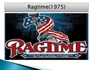 Ragtime is a music genre that emerged between 1893 and 1917, characterizing the African American experience through syncopated melodies, with Scott Joplin as a prominent composer. E.L. Doctorow's 1975 novel 'Ragtime' weaves historical and fictional characters amidst the American Dream narrative, revealing socioeconomic struggles in early 20th century America. The story highlights the intersection of race, innovation, and the quest for justice through the lives of coalhouse walker and other pivotal figures.
