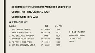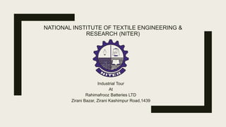 This document summarizes a student group's industrial tour of Rahimafrooz Batteries Ltd, a lead-acid battery manufacturer in Bangladesh. The 6-member group visited the factory to learn about its battery manufacturing process. They observed the sourcing of raw materials, production of different battery types, machinery used, quality assurance processes, and waste management. The tour provided insights into managing a large-scale industry, utilizing assets and manpower efficiently, and bolstering time management. The students concluded the visit helped them understand battery manufacturing processes and time management principles.