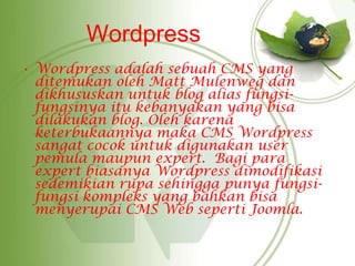 Dokumen ini membahas perbandingan antara WordPress dan Blogspot sebagai platform blogging. WordPress memiliki kelebihan seperti banyaknya plugin dan kemudahan dashboard, sementara Blogspot menawarkan dukungan HTML dan JavaScript, namun keduanya memiliki kekurangan masing-masing, termasuk masalah terkait guestbook dan komunikasi antar blogger.