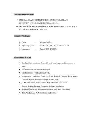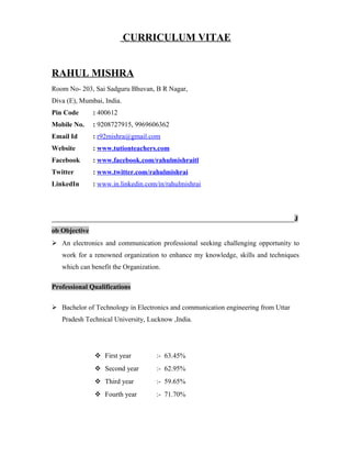This document is a curriculum vitae for Rahul Mishra that outlines his personal and professional details. It includes his contact information, educational background with a Bachelor's degree in Electronics and Communication Engineering, work experience in BMS engineering and as a field engineer, computer skills, projects, and hobbies. The CV aims to showcase Rahul Mishra's qualifications for an electronics and communication professional position at a renowned organization.
