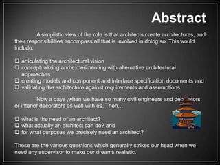 The document discusses the multifaceted role of architects in designing user-friendly spaces while managing the relationship between clients and builders. It highlights the evolving responsibilities of architects due to advancements in technology and specialization in construction, emphasizing the importance of business strategy and leadership skills. Ultimately, it conveys that success in the architect role requires a blend of technical knowledge, interpersonal skills, and a visionary approach to integrate business and technical domains.