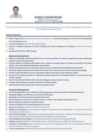 Rahul Kundyeakar has over 9 years of experience in project management, new product development, and sourcing operations. He has an MBA in Operations and training in tooling and project management. He has extensive experience executing full life-cycle development projects, ramping up projects on time and on budget. He is skilled in business development, program management, tool manufacturing, and process improvement.