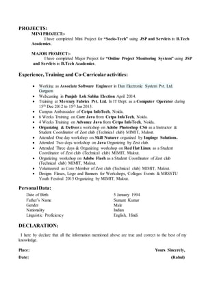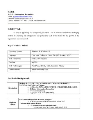 This document is a resume for Rahul, who has a B.Tech in Information Technology. It summarizes his educational qualifications including graduation from MALOUT INSTITUTE OF MANAGEMENT AND INFORMATION TECHNOLOGY with a 76.35% aggregate. It also lists his technical skills such as Java, MySQL, and HTML. Rahul has work experience as an Associate Software Engineer and has completed projects using JSP and Servlets. He has participated in several workshops and training programs and serves as a coordinator for his college's technical club.
