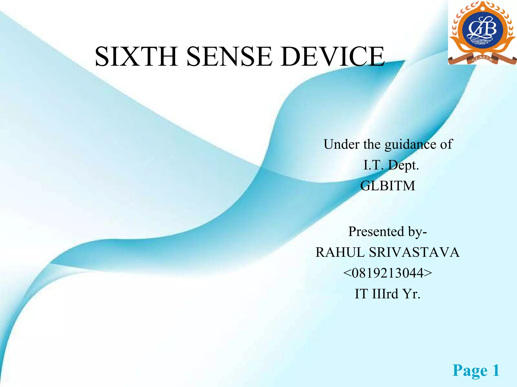 Sixth Sense is a wearable device consisting of a camera, projector, and mirror coupled in a pendant. The camera tracks hand gestures to interact with projected information from a connected smartphone. It allows users to access digital information about objects, maps, time, and more through natural hand gestures by projecting this information onto surrounding surfaces. Some example applications include making calls, getting navigation directions, checking the time, and taking photos through hand gestures.