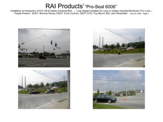 The document describes the installation of RAI Products' "Pro-Seal 6006" loop sealant at the intersection of SR 138 and Oakley Industrial Boulevard on June 23, 2005. Representatives from GDOT and RAI observed the installation of the sealant on the loop in the Oakley Industrial Boulevard turn lane. The installation is documented over 15 pages.