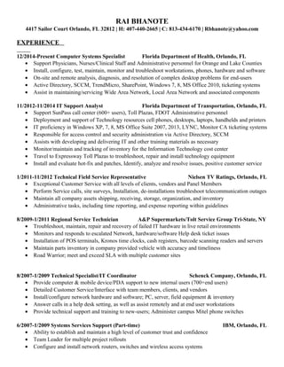 Rai Bhanote has over 25 years of experience in IT support roles. He has worked for various organizations in Florida providing desktop support, network administration, and hardware installation and maintenance. His background includes experience with Windows, Active Directory, networking, and security administration. He is bilingual in English and Spanish.