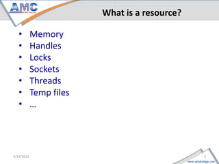 The document discusses resource acquisition and initialization (RAII) in C++. It explains that resources like memory, handles, locks etc. need to be acquired and released properly to prevent leaks. The RAII pattern uses object destructors to ensure resources are released deterministically even after exceptions. It demonstrates using classes to represent resources that acquire the resource in the constructor and release it in the destructor. Finally, it discusses how languages like C# and Java implement disposal patterns and how scope guard can provide an alternative to unique_ptr for resource management in C++.