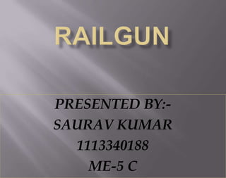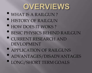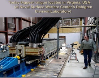 Railgun is an electrically powered projectile launcher that uses magnetic fields to accelerate a conductive projectile to hypervelocities. It was first conceptualized in 1918 but early prototypes were not tested until the 1970s. The U.S. Navy has achieved muzzle velocities over 3.2km/s from railgun tests. Advantages over traditional gunpowder weapons include greater range, speed and efficiency with no explosive propellants required. Current challenges include thermal management of the rails and developing more compact pulsed power supplies.