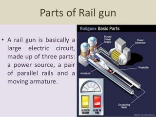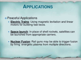 The document discusses railguns, including their history, parts, working principle, current research and development, advantages, disadvantages, and applications. Railguns use electromagnetic force to accelerate a conductive projectile along two parallel conductive rails. They were first proposed in 1918 and prototypes were tested in the 1970s. Current research aims to increase muzzle velocities for applications like launching satellites. Railguns offer higher velocities than chemical guns but challenges include thermal management and structural stresses on rails.