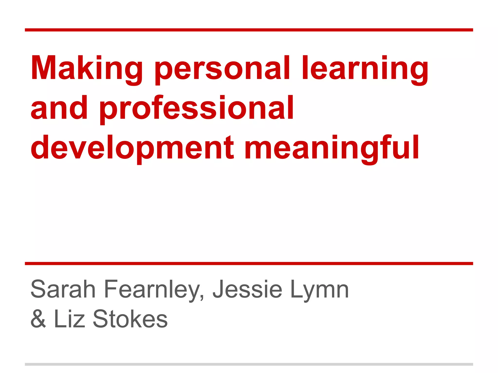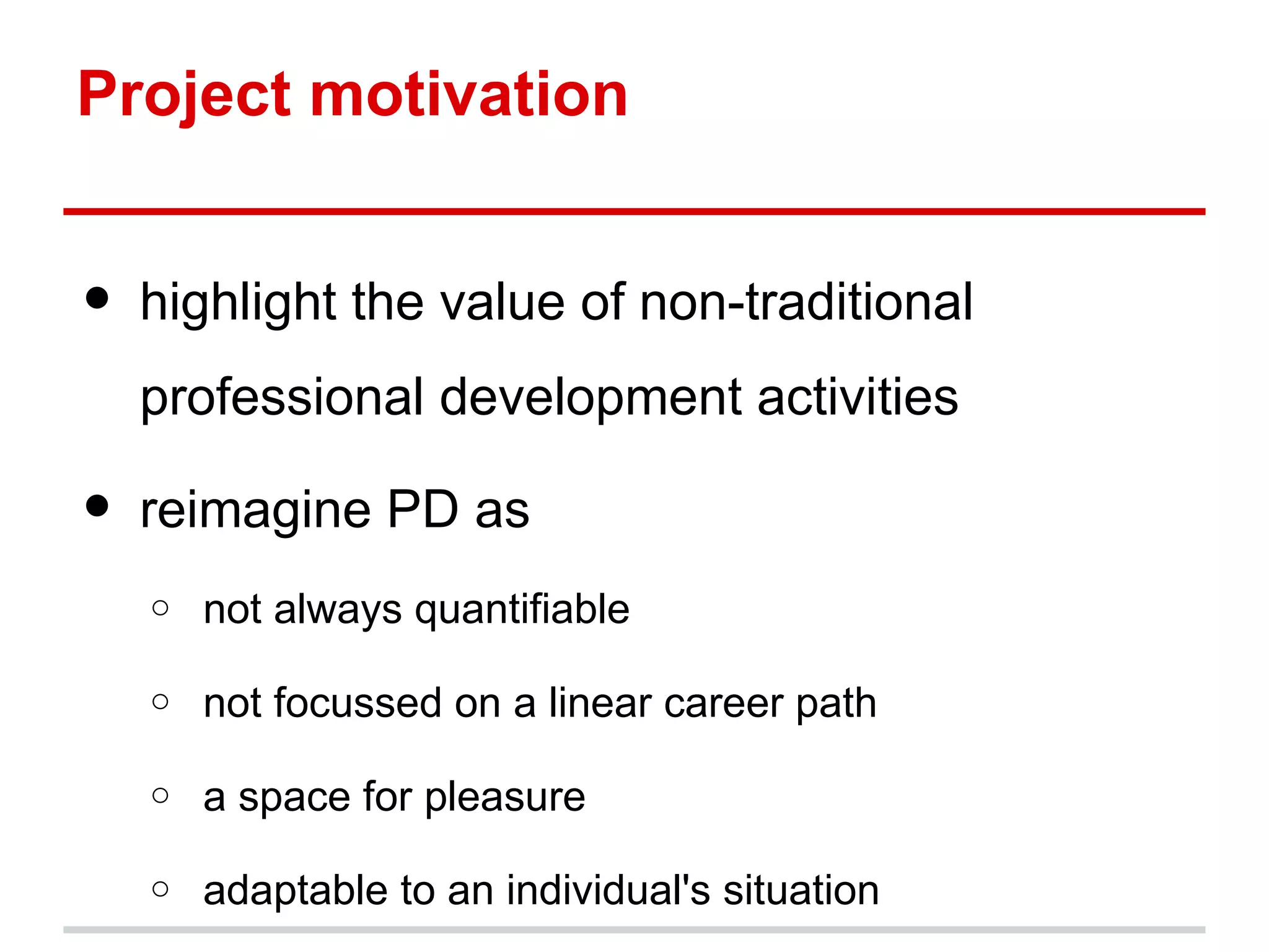 This document summarizes a research project exploring how professional development and personal learning for information professionals can be meaningful outside of traditional career progression models. The researchers conducted a literature review and meetings to explore this question. Their preliminary findings identified some key themes: the need for a critical reflective space to discuss professional development; looking beyond traditional models to other contexts; tensions around professional identity; and the importance of communities of practice. The researchers suggest these findings imply the field should look to other models for inspiration, make space for reflection, recognize the personal value of professional development, and further examine issues of professional identity.