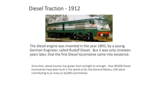 The document discusses the history and development of diesel and electric traction for railways. It provides details on railway electrification in India, including key parts of electrification infrastructure like overhead line equipment, traction substations, and signaling systems. It also describes the cost estimation methodology used by Indian Railways, called the CPM method, which takes into account factors like terrain, land use, speed, track layout and electrification to estimate project costs. Electrification has increased over time in India under successive five-year plans to reduce operating costs and diesel consumption.