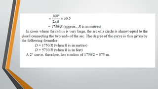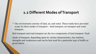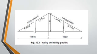 The document discusses railway engineering, comparing land transport modes, particularly rail and road transport, examining their features such as tractive resistance, cost analysis, and environmental impact. It details the alignment of railway lines, emphasizing the importance of careful planning for economic efficiency, safety, and aesthetic considerations. The document also outlines the need for new railway lines, types of surveys conducted, and procedures for assessing feasibility and cost, highlighting the complexities involved in railway construction projects.