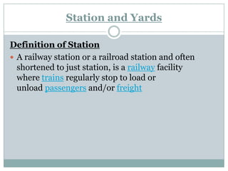 The document provides a comprehensive overview of railway engineering, focusing on the definitions, purposes, types, and classifications of railway stations and yards. It details different station types such as wayside, junction, and terminal stations, as well as various yard types like passenger yards, goods yards, and marshalling yards. Additionally, it describes essential railway equipment and facilities needed for effective operation and maintenance of railway systems.