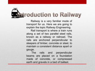 Rail transport involves trains running along parallel steel rails called a railway or railroad. The rails are placed on a foundation of concrete or other materials and are held in place by perpendicular sleepers made of timber, concrete, or steel. Indian railways began construction in the 1850s and now consists of multiple zones with different rail gauges. Rail alignment is influenced by terrain and other factors. Rails come in different types but flat footed rails are now most common. Rail joints connect adjacent rails while sleepers support the rails and distribute weight.