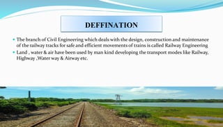 This document provides an overview of railway engineering. It defines railway engineering as dealing with the design, construction, and maintenance of railway tracks. It then discusses the history of railways in India and introduces some key terms like railway track components, gauge, rails, sleepers, ballast, and fasteners. The railway track combines rails, sleepers, ballast, and other components to form the permanent way for train movement. Different types of rails, sleepers, and gauges used in India are also outlined.