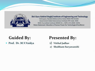 This document presents an online train ticket booking system developed by Vitthal Jadhav and Shubham Suryawanshi, guided by Prof. Dr. M.V. Vaidya. The system allows passengers to book, cancel, and search train tickets online through a simple GUI. It was developed using HTML, CSS, Bootstrap, Python Django and SQLite database. Key modules include booking, cancellation, passenger details, train schedules, and reports. Data flow diagrams and use case diagrams are also presented, along with conclusions about the project and possibilities for future improvements.
