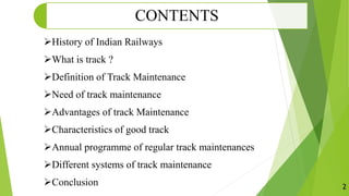 The document discusses the history and significance of Indian Railways, its extensive network and employment figures, and details about track maintenance, including its definitions, needs, advantages, and methods. It covers the characteristics of a good track, maintenance schedules, and operational procedures, emphasizing the importance of effective track maintenance for safe and efficient railway operations. The author concludes that Indian Railways is committed to improving track maintenance practices.