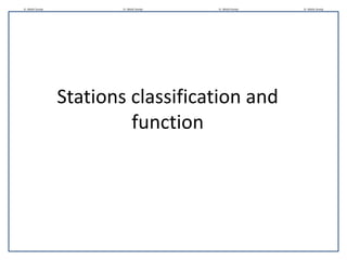 Railway stations are places on a line where trains halt for purposes like exchanging passengers and goods, controlling train movement, and providing amenities to locomotives. Stations are classified based on their operational functions as block stations (Class A, B, C), non-block stations (Class D), or special class stations. They are also classified based on functional roles as wayside/non-junction stations, junction stations where lines merge, or terminal stations that are the final destination. Site selection factors for stations include acquiring suitable land, proximity to towns, drainage, and providing amenities like water and diesel.