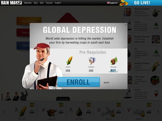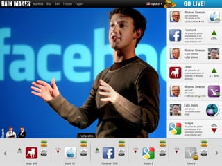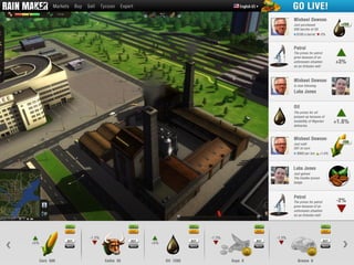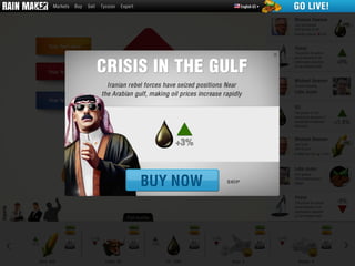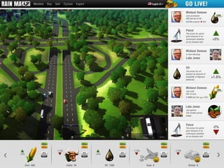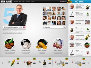 Rain Maker is a stock trading platform that integrates real-world market data with a social, gamified experience. Players can trade commodities, choose careers, and are influenced by real-world events, affecting their gameplay and resources. The platform encourages cooperation through public quests, where multiple players work towards a common goal.