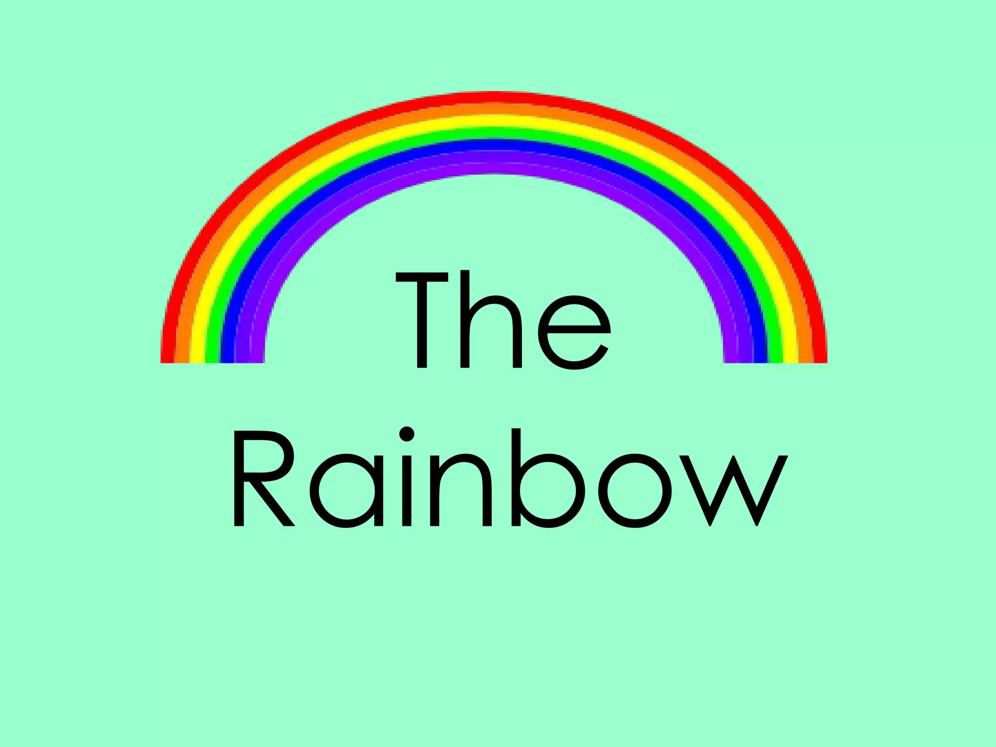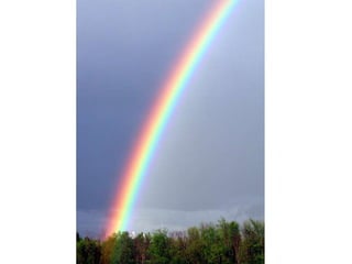 The document discusses the rainbow, noting that it appears when it rains and the sun is shining. It lists the 7 colors of the rainbow as red, orange, yellow, green, blue, indigo, and violet.
