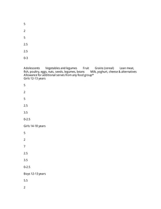 The document provides recommended daily intake amounts for a variety of food groups based on age, gender and life stage according to the Australian Dietary Guidelines. It recommends consuming foods from the core food groups of vegetables, fruits, grains, protein foods and dairy in specific serving amounts each day to achieve a healthy, balanced diet. Additional allowances are provided for extra servings and healthy fats. Separate guidelines exist for infants and toddlers under age 2.