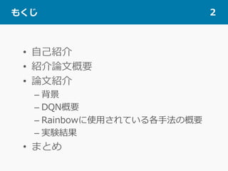 もくじ 2 •  ⾃⼰紹介 • 紹介論⽂概要 •  論⽂紹介 – 背景 – DQN概要 – Rainbowに使⽤されている各⼿法の概要 – 実験結果 •  まとめ