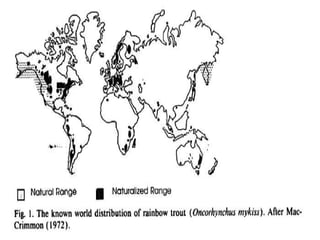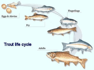 The rainbow trout is a colorful fish native to North America west of the Rocky Mountains. They have a pink stripe along their sides and small black spots on their back and fins. Rainbow trout spawn in spring and move to small tributaries or lake inlets to lay their eggs. The species is very adaptable and can thrive in places where other trout struggle.