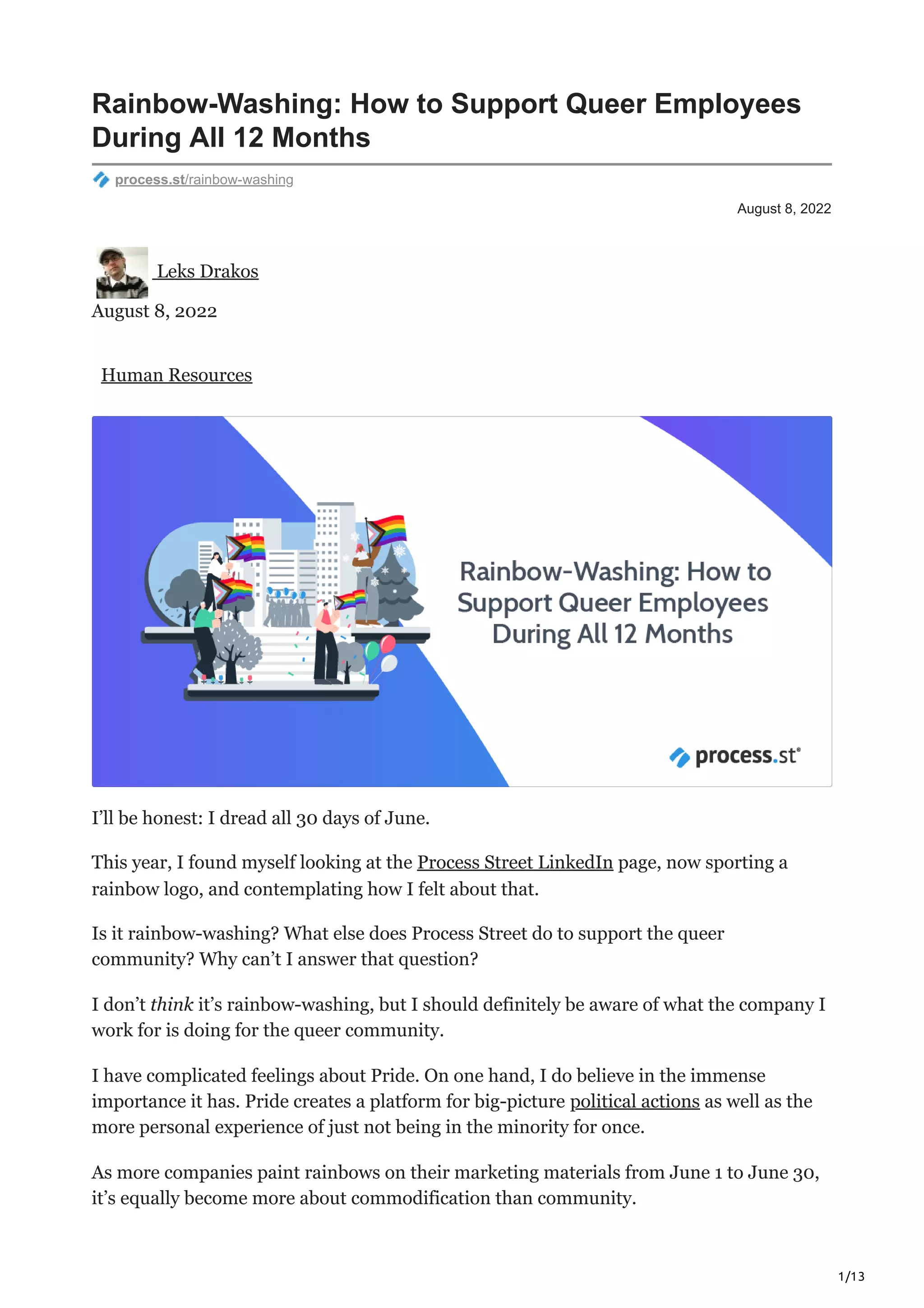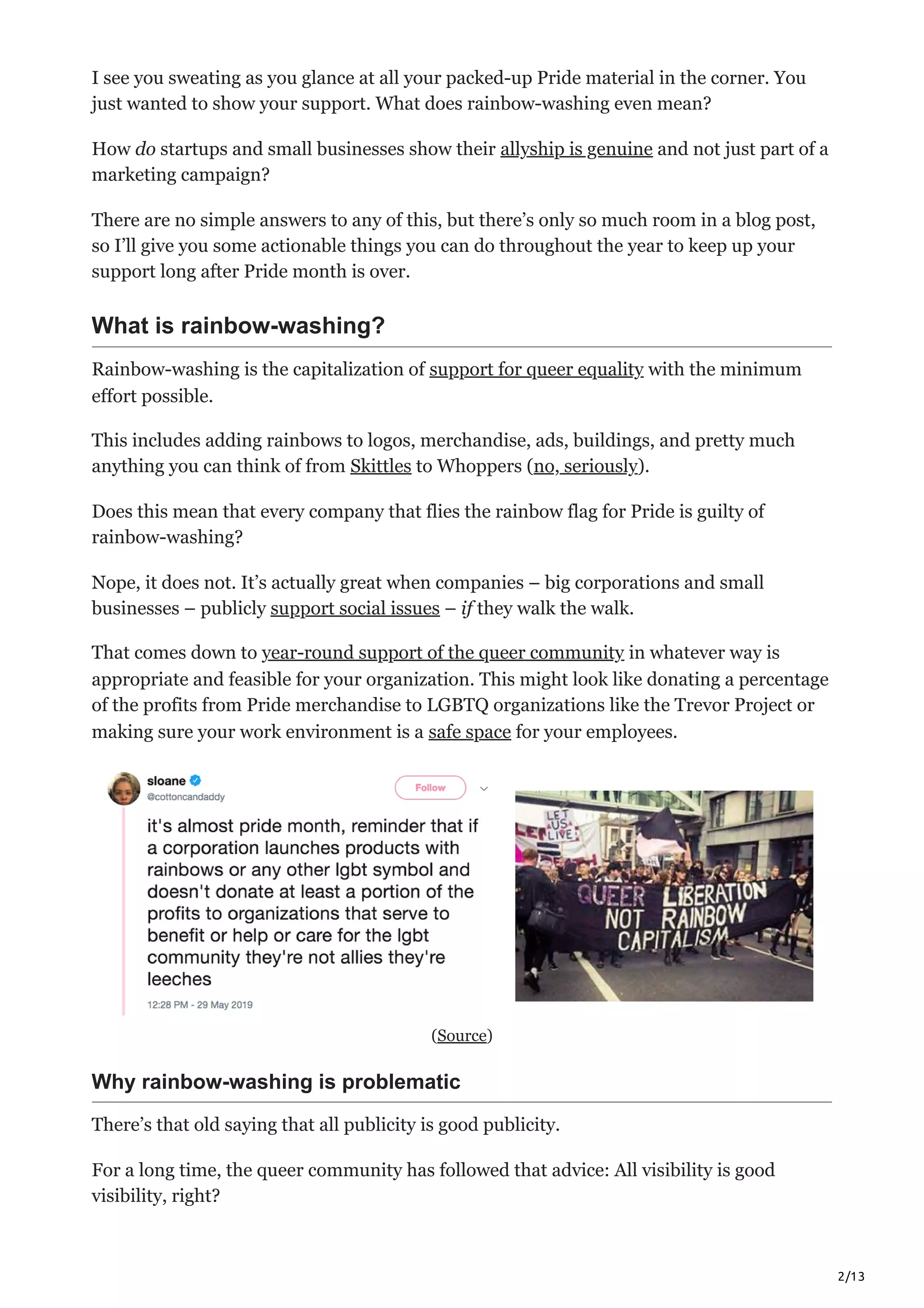 The document discusses the issue of rainbow-washing, where companies superficially support LGBTQ+ pride through marketing without genuine allyship. It emphasizes the importance of year-round commitment to the queer community, including meaningful actions like donations and creating safe work environments for queer employees. The author calls for companies to prioritize authentic support over mere visibility during Pride Month, urging them to educate themselves and engage in genuine allyship.