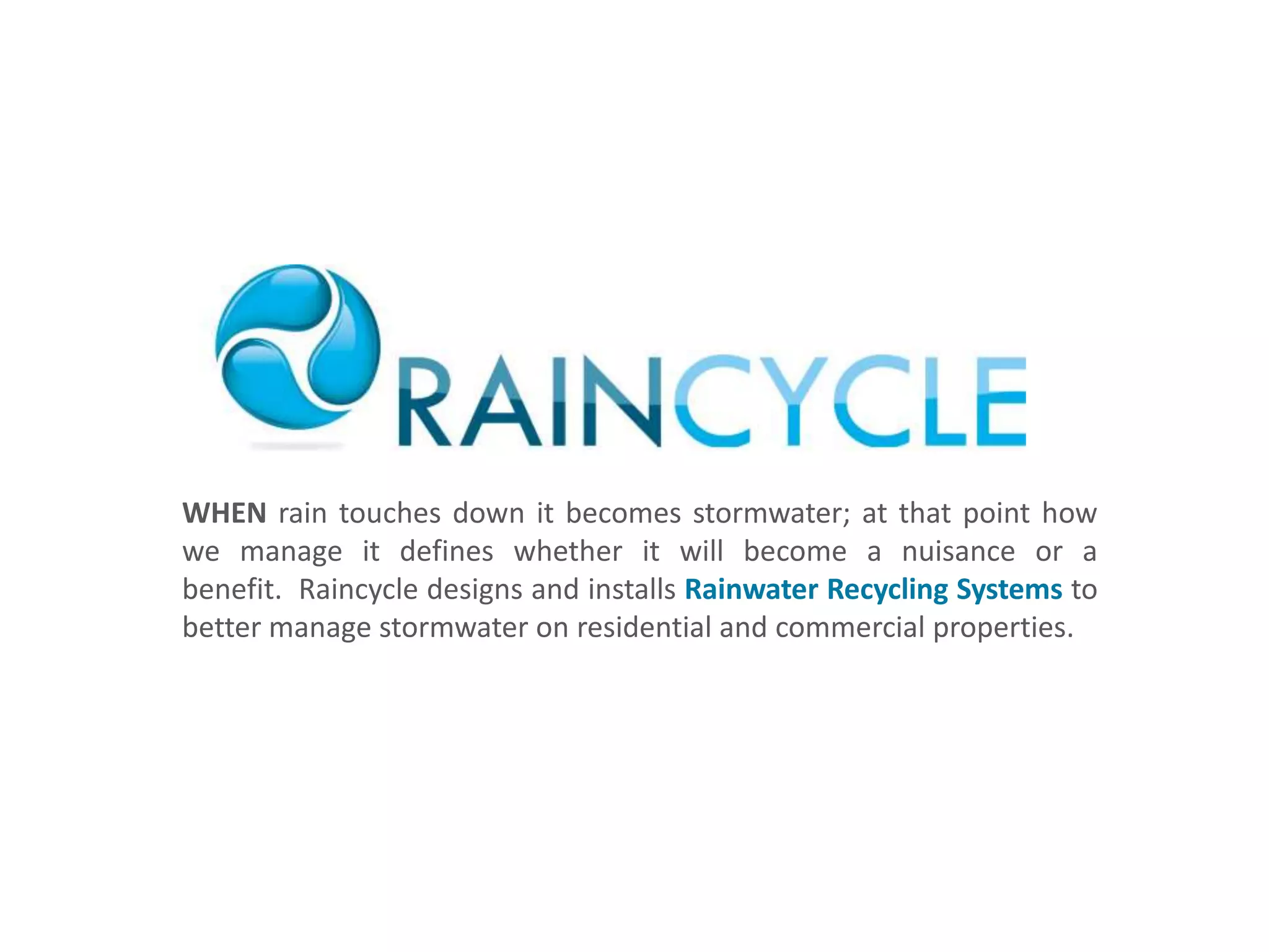 The document discusses rainwater recycling systems for managing stormwater. It summarizes the benefits of rainwater recycling including compliance with stormwater ordinances, cost savings, and sustainability. It then provides details on system components, design considerations, installation, and case studies. Residential and commercial examples are given to illustrate how rainwater can be collected and used for irrigation, flushing toilets, and other non-potable needs while reducing stormwater runoff.