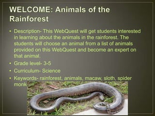 This document outlines a WebQuest that teaches students about rainforest animals through research and presentation. Students are split into groups and each picks a rainforest animal to become an expert on. They research the animal's habitat, diet, lifespan and dangers. Each student creates a slide on the animal for a group PowerPoint presentation. The document provides resources like websites and videos for students to use in their research. The goal is for students to learn about different rainforest animals and their conservation through hands-on research and collaboration.