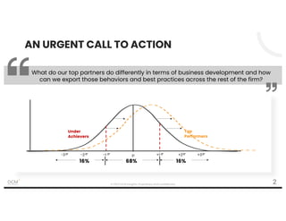 The Rainmaker Genome Project identifies key business development behaviors of top-performing partners in various professional service firms, emphasizing proactive client engagement and strong relationship-building. The study outlines different partner archetypes—expert, confidant, activator, debater, and realist—each with distinct approaches to business development, revealing the widening gap between top performers and average achievers. Recommendations for firms include fostering a supportive culture for 'activator' behaviors, implementing relevant training, and enhancing technology use to optimize business development efforts.