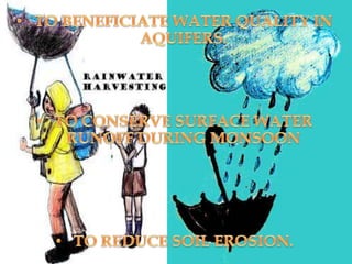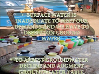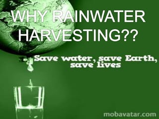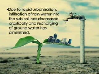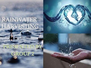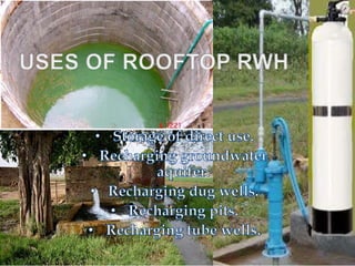 Rainwater harvesting is the process of accumulating and storing rainwater before it reaches aquifers by capturing it from catchment surfaces like rooftops. Rooftop rainwater harvesting involves collecting rainwater from rooftops and storing it in reservoirs to meet household needs, while surface runoff harvesting collects rainwater from surfaces on the ground.