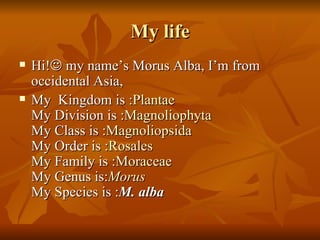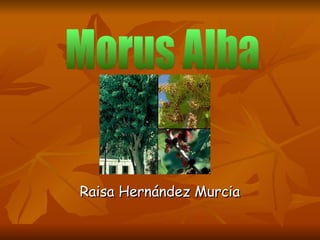 This document summarizes information about Morus alba, commonly known as the white mulberry tree. It describes the tree's taxonomic classification, physical characteristics such as its brown, rough trunk and oval leaves, its small white or reddish fruit, and its cultivation for feeding silkworms whose cocoons are used to make silk.