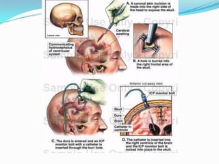 3) Monitoring devices include external ventricular drains and fiberoptic monitors, though all have advantages and disadvantages.