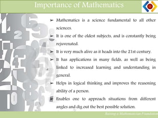 The document outlines the 'Raising a Mathematician Foundation' program aimed at enhancing students' critical thinking and research mentality through a hands-on approach to learning mathematics. It highlights the importance of mathematics as a foundational science and details the program's structure, targeted outcomes, and key faculty members. The initiative seeks to foster a deeper understanding of secondary and higher secondary level mathematics, encouraging students to apply these concepts in real-life scenarios.