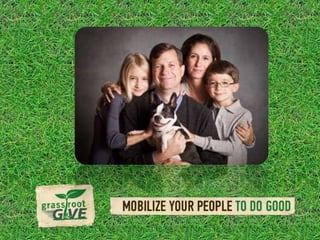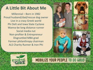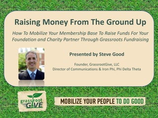 This document discusses how to mobilize membership bases to raise funds for foundations and charities through grassroots fundraising. It introduces the speaker and his background working in philanthropy. The presentation goals are to educate about grassroots trends fueling fundraising, have attendees think differently about fundraising, and leave enthused. Examples provided include Iron Phi, a Phi Delta Theta program where members complete athletic feats and raise money for ALS, with over $348k raised. The speaker advocates a Greeks for Good program for any organization to engage members in online fundraising with curriculum and tracking of dollars raised.
