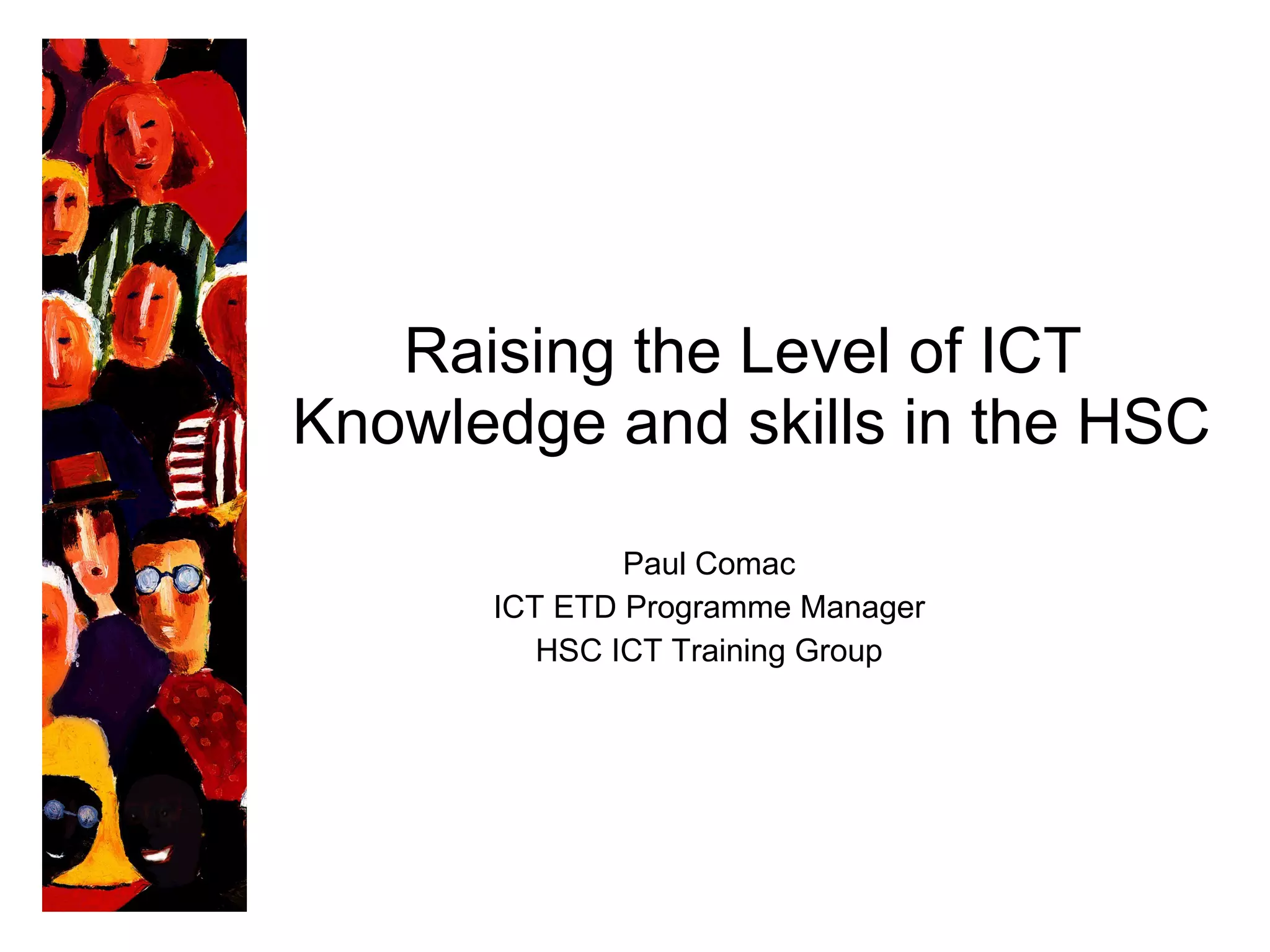 The document discusses raising ICT knowledge and skills in the health sector. It outlines the background and aims of the HSC ICT training strategy, which recognizes the importance of ICT skills for professionals. The strategy's objectives include establishing informatics as a core element of professional education, supporting ICT skills development in primary care, identifying accredited qualifications, establishing mechanisms to develop the ICT agenda, and providing training support for key ICT infrastructure projects. While competing priorities have made ICT a lower priority, the strategy acknowledges the importance of ICT training for professional development. Improving staff ICT knowledge and skills is crucial to implementing the strategy and realizing the potential of ICT.