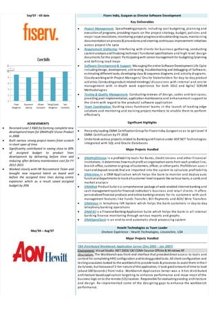 The document provides a summary of a technical professional's skills and experience. It includes details about their current role as Director of Software Development at Fiserv India, where they manage a team of 80 people. Previous experience includes project management, software development, team leadership, and domain expertise in banking, finance and other industries. Key skills include project management, agile methodologies, strategic planning, system architecture, training and leadership. The professional has over 17 years of experience leading teams and initiatives across various organizations.