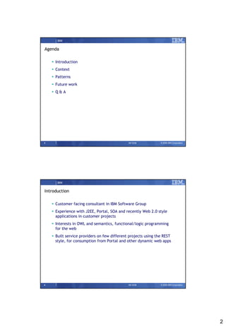 This document summarizes a presentation on REST design patterns for service-oriented architecture (SOA). The presentation discusses introducing REST-inspired patterns for SOA design, including the Uniform Interface pattern, Entity Linking pattern, and Transport Caching pattern. It provides examples and applications of each pattern with a focus on leveraging the REST architectural style for SOA implementations.