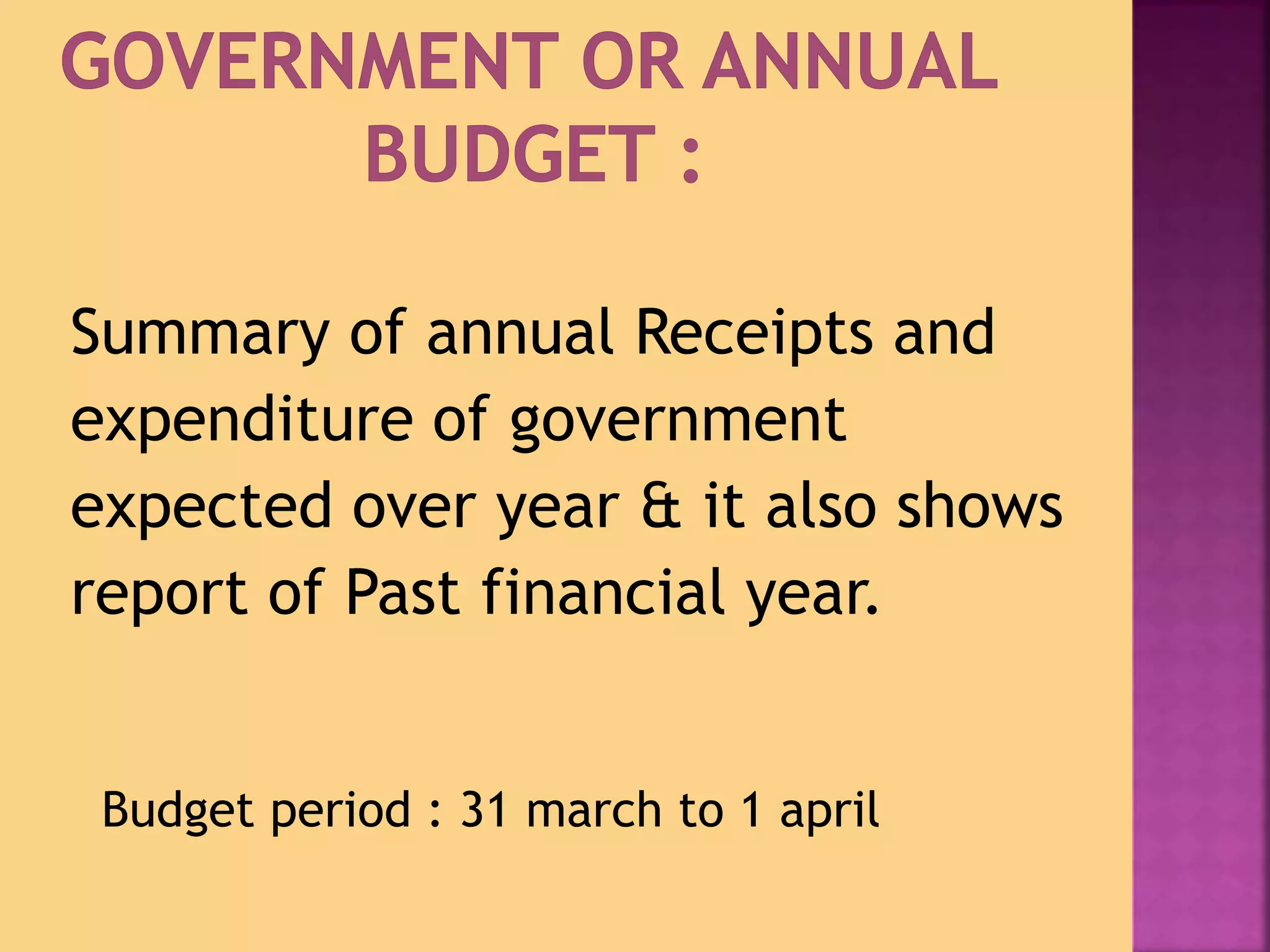The document summarizes the key aspects of a government's annual budget, including receipts, expenditures, the budget period, the goals of economic stability and growth. It defines surplus and deficit budgets and the types of expenditures and revenues. Fiscal and primary deficits are explained, and it notes that the finance minister declares the budget at the end of February for approval by March 31st.