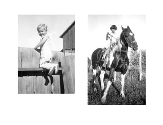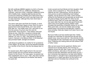 This document provides an overview of the author's family history and upbringing. It discusses her ancestors on both her mother and father's side who were farmers, ranchers, and pioneers. It then describes her parents meeting and marriage, her birth and childhood in Colorado and New Mexico, and her father joining the LDS church when she was eight years old. The summary focuses on the key events and people discussed.