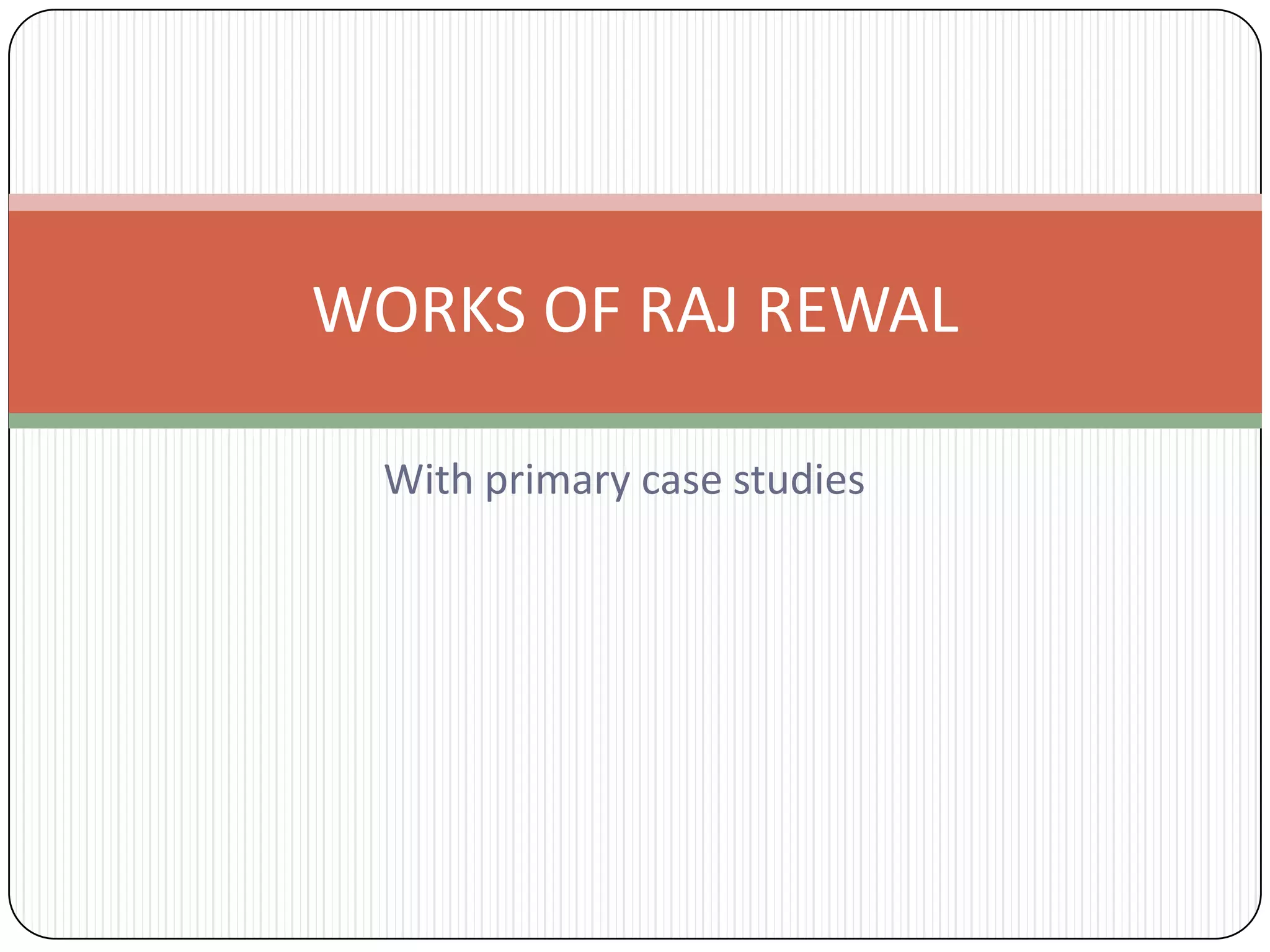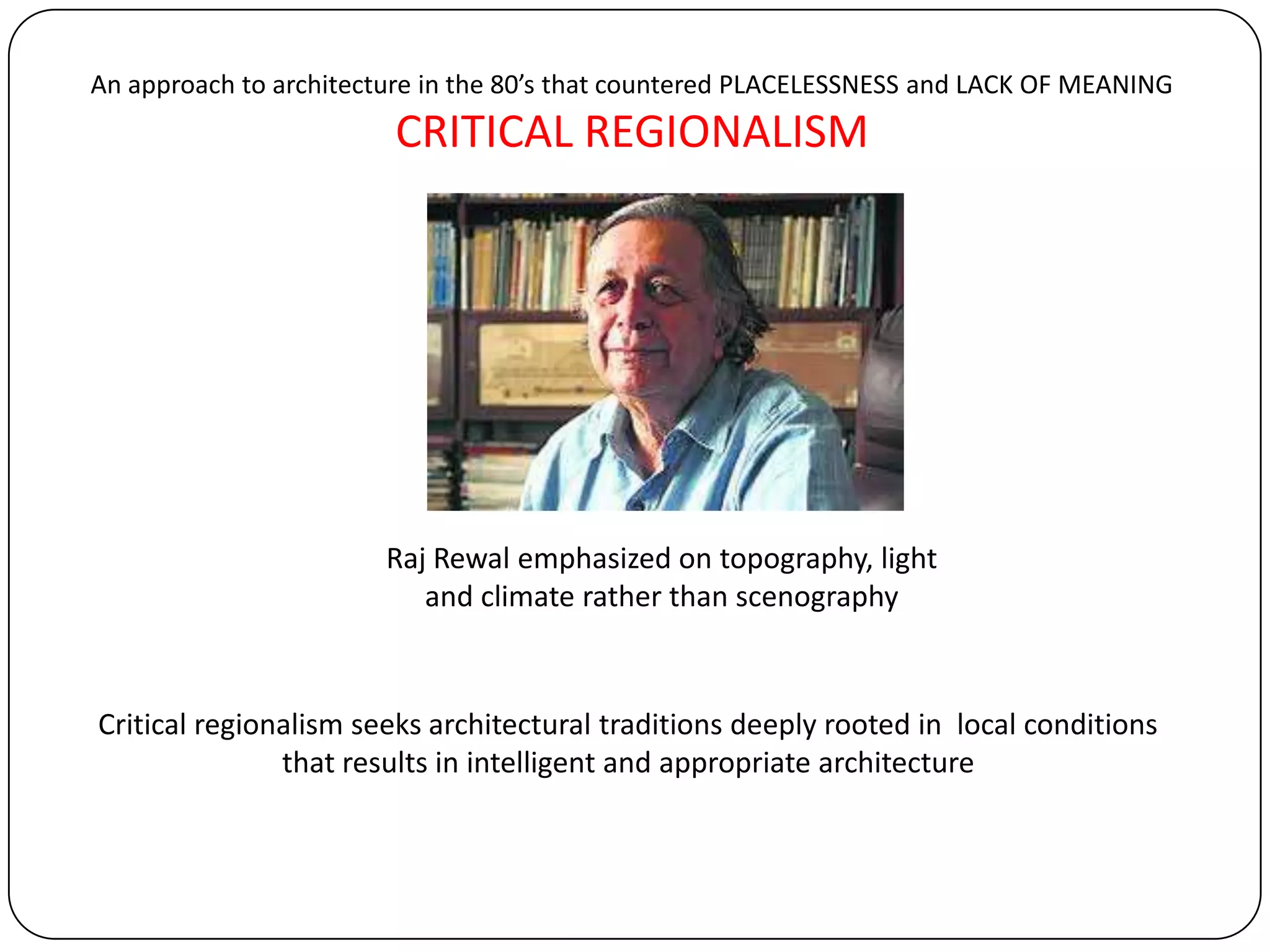 Raj Rewal was an Indian architect known for his approach called "critical regionalism" which emphasized local topography, climate, and traditions rather than scenography. Some of Rewal's notable works that exemplified this approach included the State Trading Corporation Tower in New Delhi which used a structural concept as the basis for its architectural form. Rewal also designed housing complexes that created livable spaces through techniques like stacked apartments with shifted footprints to allow for private terraces and pedestrian pathways and gathering spaces. One such housing development was the Asian Games Village in New Delhi from 1982 which took inspiration from traditional villages in Rajasthan through its network of streets, squares and urban morphology.