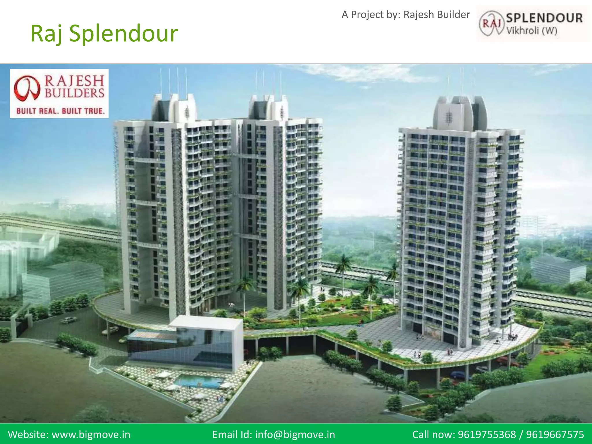 Raj Splendour is a residential complex by Rajesh Builders that features three multi-storeyed towers offering well-planned 2 and 3 BHK flats, with luxurious amenities such as a clubhouse, gym, and swimming pool. Each flat is designed with high-quality finishes, including vitrified tiles and modern kitchen facilities, while the complex is located conveniently near key transport and urban facilities. With a legacy of nearly 45 years, Rajesh Builders emphasizes quality, ethics, and commitment in their construction and development projects in Mumbai.