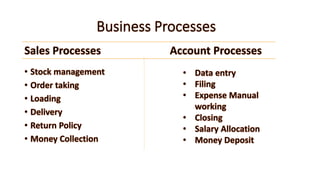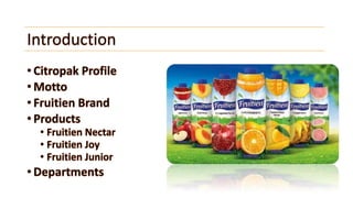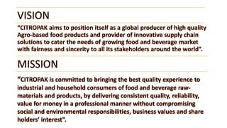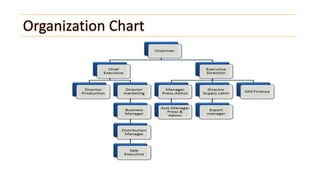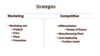 The document outlines the strengths, weaknesses, opportunities, and threats for a manufacturing company. The company's strengths include owning its manufacturing plant, exporting fruit pulps, having a single owner and experienced management team, and good employee relations. Weaknesses are a small warehouse, lack of salesperson cabins, and limited popularity and manual work. Opportunities exist to improve working conditions, expand regionally, and boost branding; while threats include insufficient market recovery, many competitors, and inflation reducing savings.