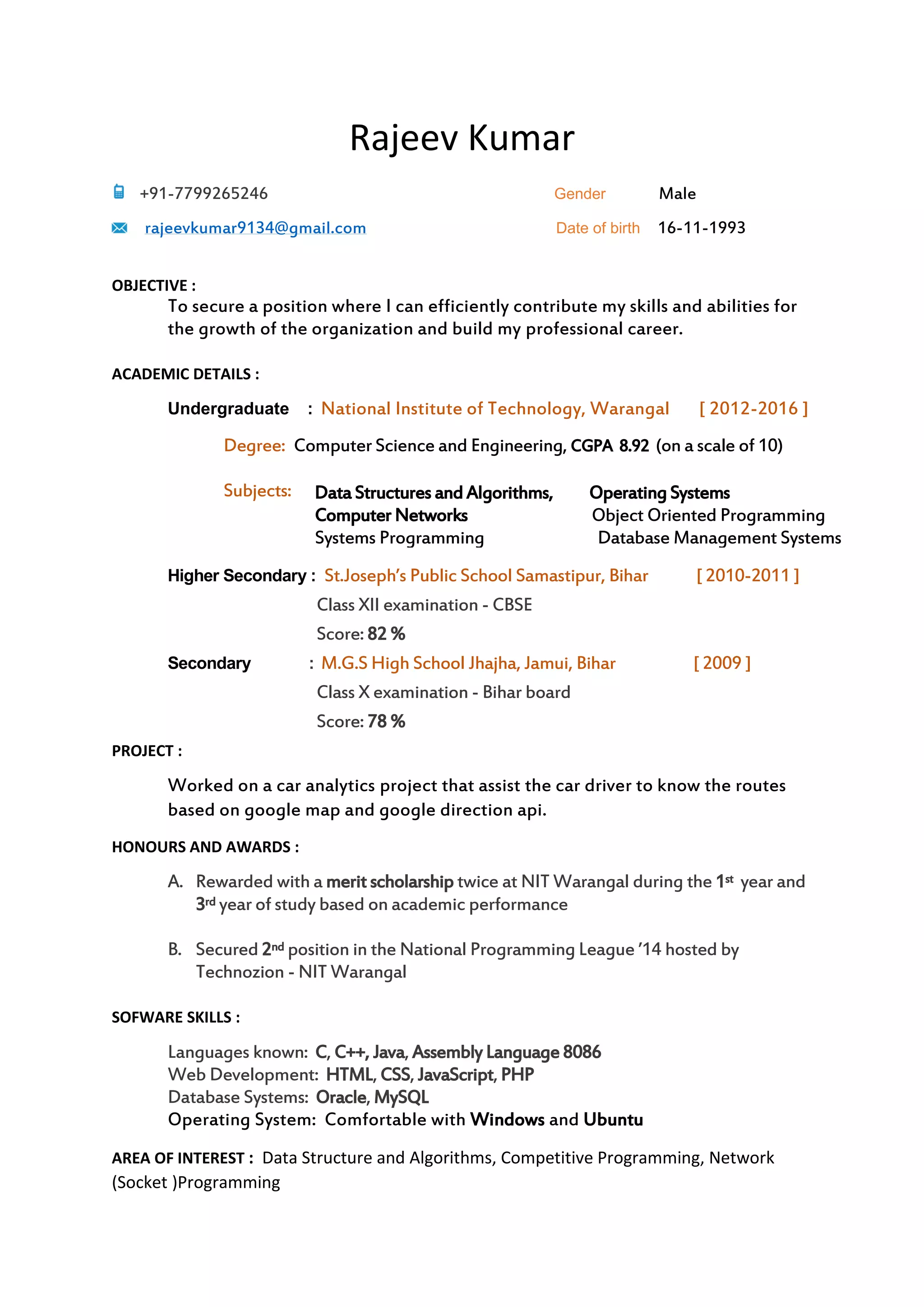 Rajeev Kumar is seeking a position where he can contribute his skills and abilities to help an organization grow. He has a Bachelor's degree in Computer Science and Engineering from National Institute of Technology, Warangal with a CGPA of 8.92. He worked on a car analytics project using Google Map and Google Directions APIs. He received merit scholarships twice from NIT Warangal based on his academic performance and secured second position in a national programming competition. His software skills include languages like C, C++, Java, and Assembly along with web development, databases, and operating systems. His areas of interest are data structures and algorithms, competitive programming, and computer networks.
