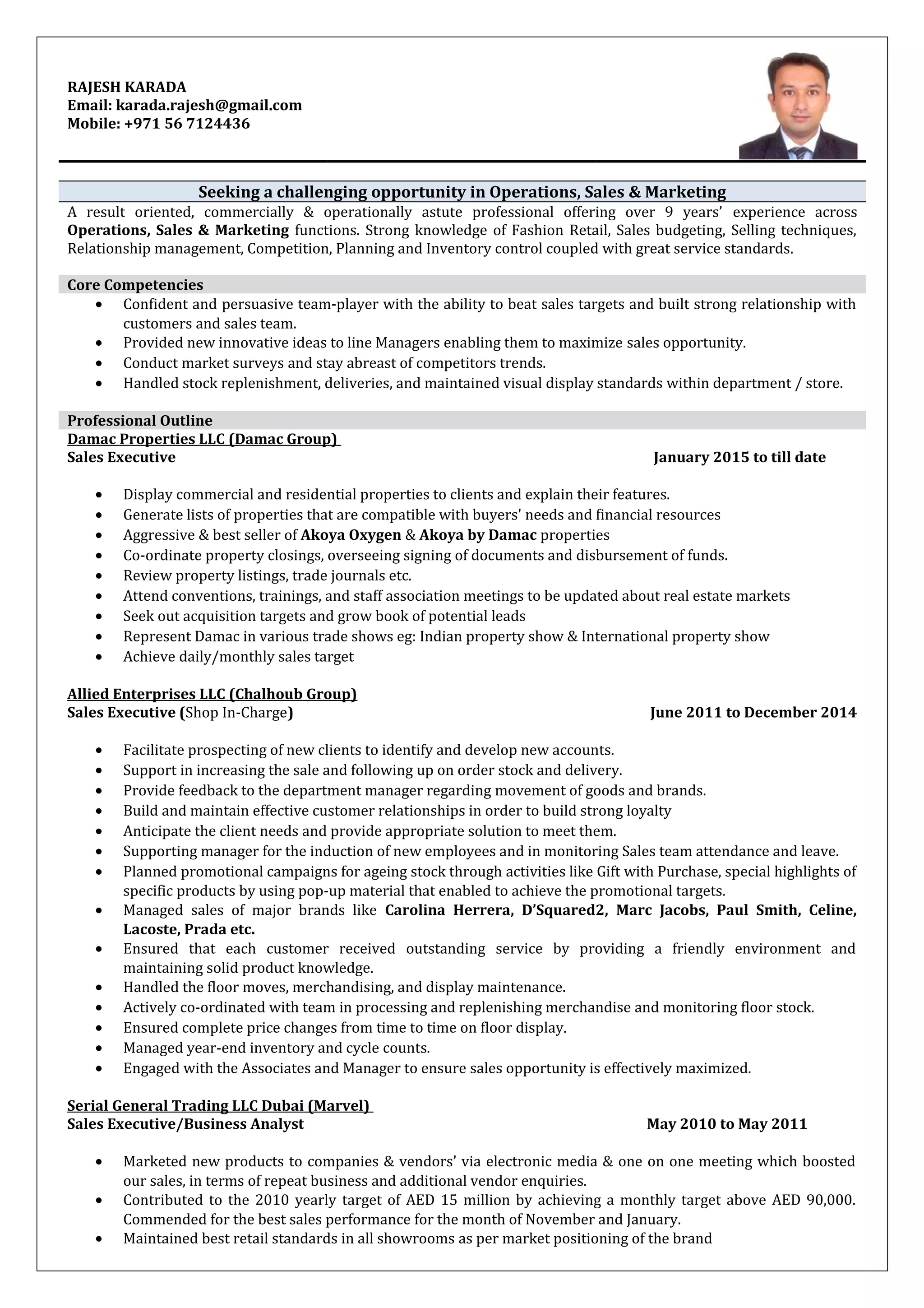 Rajesh Karada is a results-oriented professional with over 9 years of experience in operations, sales, and marketing across various roles in the fashion retail and real estate industries. He has a track record of exceeding sales targets and providing innovative ideas to maximize sales opportunities. Karada is now seeking a new challenging opportunity that allows him to utilize his strong skills in relationship management, sales, marketing, and inventory control.