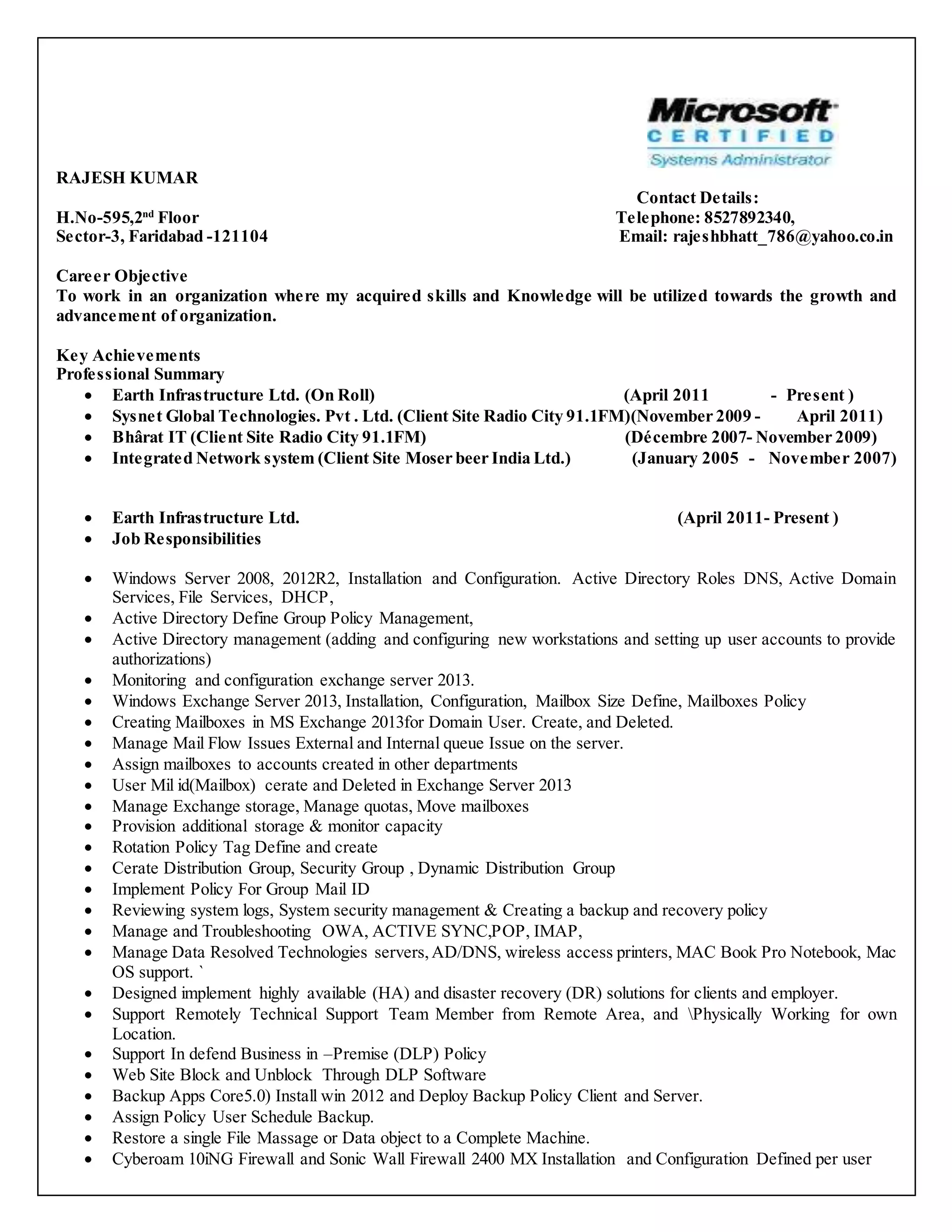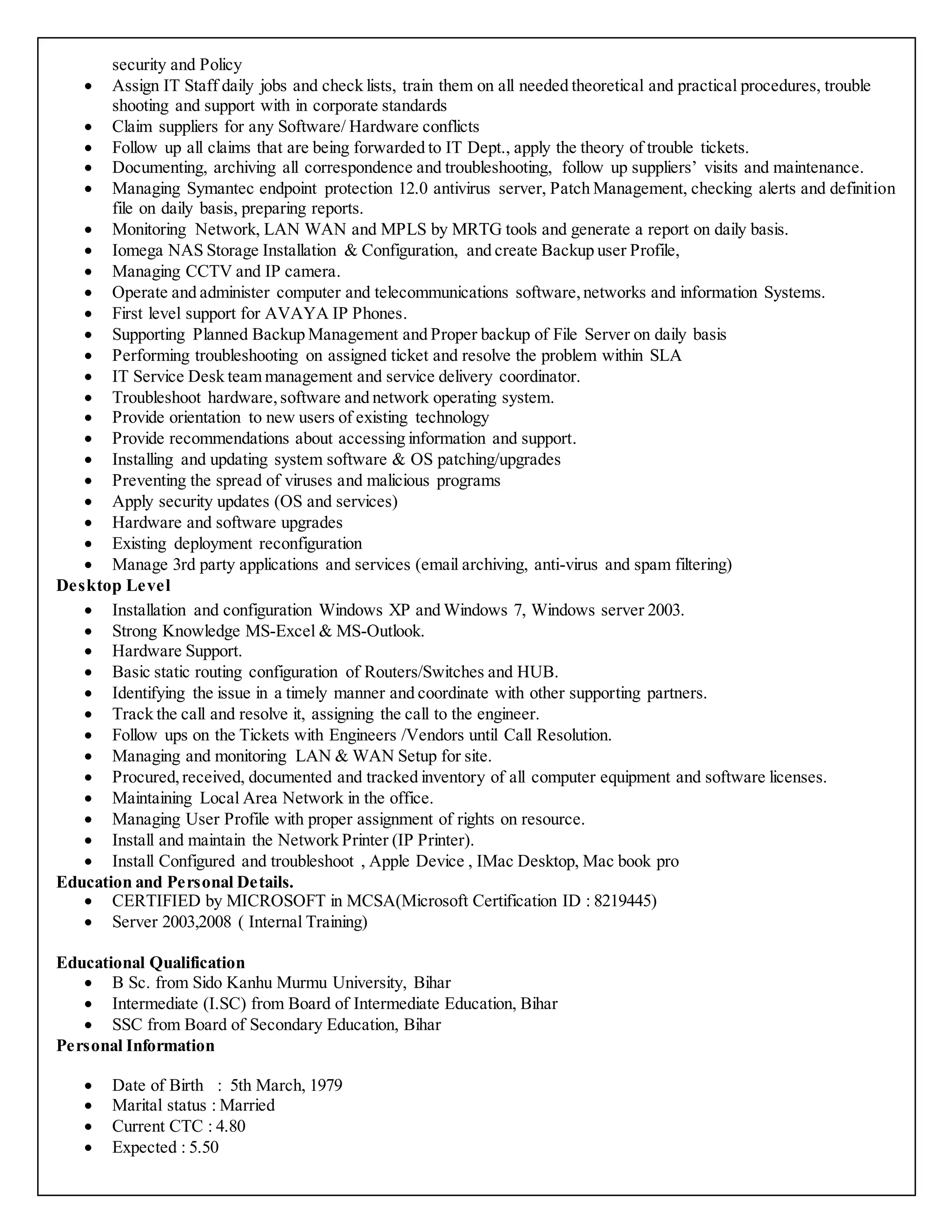 Rajesh Kumar has over 15 years of experience in IT support roles. He has worked for several companies providing server administration, desktop support, network administration, and user support. His responsibilities have included managing Windows servers, Active Directory, Exchange servers, firewalls, backups, antivirus systems, and other IT infrastructure. He has an MCSA certification in Server 2003 and experience with technologies like Windows, Exchange, and virtualization.