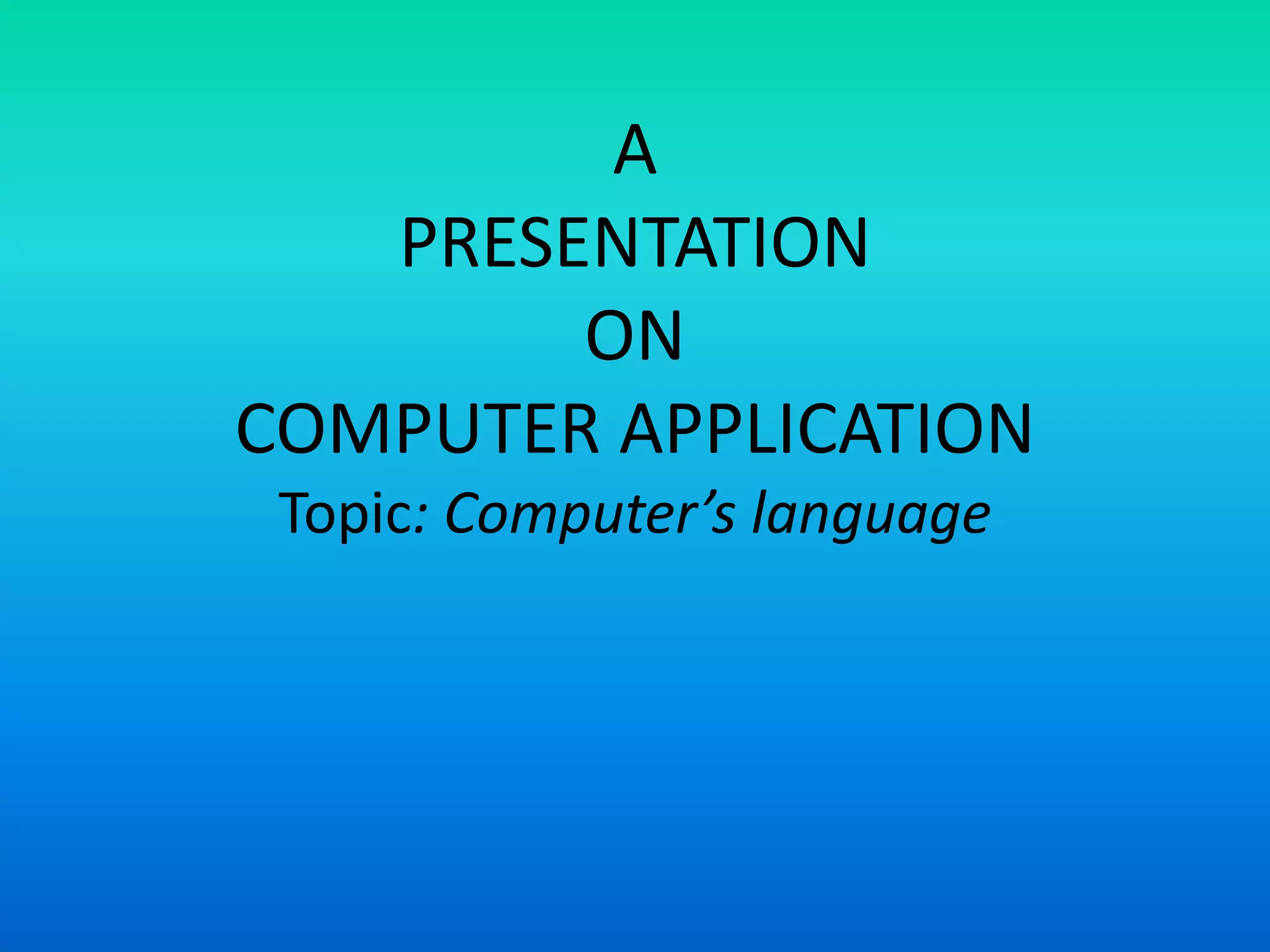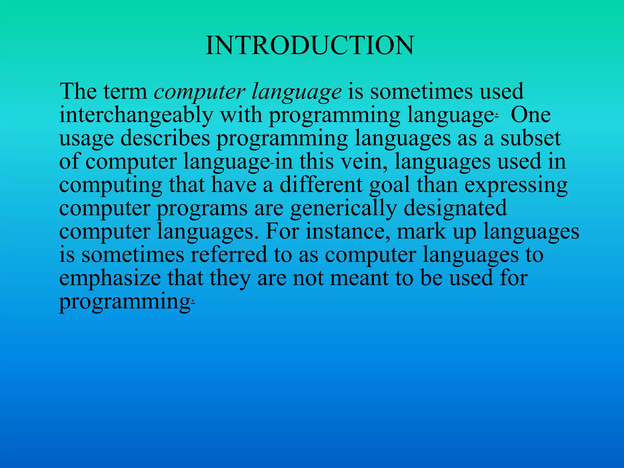 This document discusses different types of computer languages. It begins by distinguishing between programming languages and other computer languages like markup languages. It then categorizes languages as either low-level or high-level. Low-level languages like machine language and assembly language are closer to machine code, while high-level languages use English-like syntax and are translated to machine code. Several examples of each type are provided along with their advantages and disadvantages.