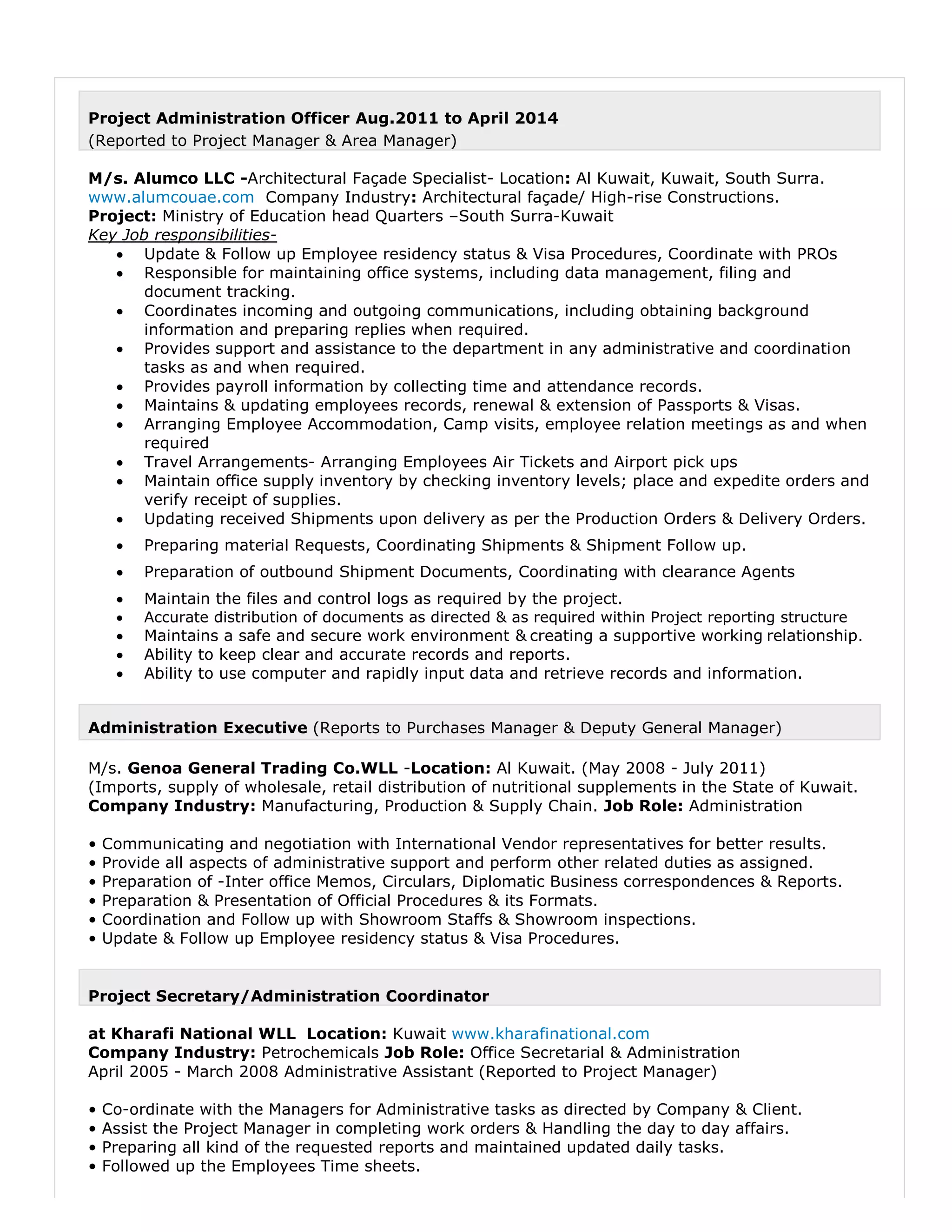 Rajesh P V is an experienced administrator and HR professional seeking a new role. He has over 10 years of experience in administration, HR, project coordination, and customer service roles. Currently he works as a site administrator for a construction company in Kuwait, where his responsibilities include HR documentation, recruitment, payroll, and employee relations. He holds a Master's degree in business management and is proficient in Microsoft Office, databases, and other office software.