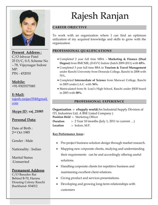 This document contains Rajesh Ranjan's resume. It includes his personal details like name, date of birth, address, qualifications including a dual MBA degree and BBA degree. It outlines his 2 year work experience as a Marketing Officer at eSupply World where he performed tasks like managing clients, marketing campaigns, and sales. It also lists his computer skills in programs like SAP, MS Office, and his interests in activities like music, cricket and traveling.